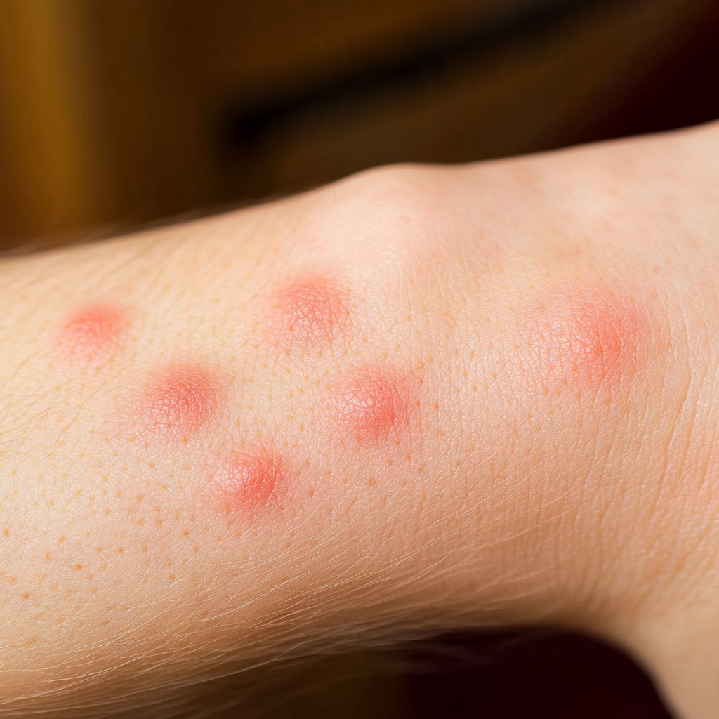 Bed Bug Bite: Bed bugs usually leave a series of bites on exposed skin (arms, neck, face). The bites appear as red, swollen spots with mild itching that can intensify over hours or days.