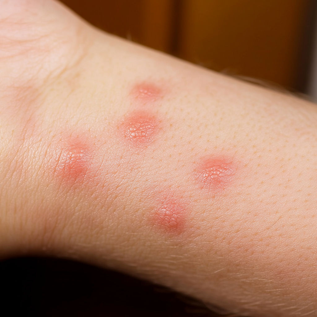 Bed Bug Bite: Bed bugs usually leave a series of bites on exposed skin (arms, neck, face). The bites appear as red, swollen spots with mild itching that can intensify over hours or days.