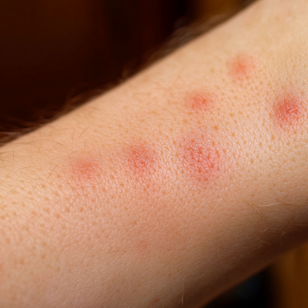 Bed Bug Bite: Bed bugs usually leave a series of bites on exposed skin (arms, neck, face). The bites appear as red, swollen spots with mild itching that can intensify over hours or days.