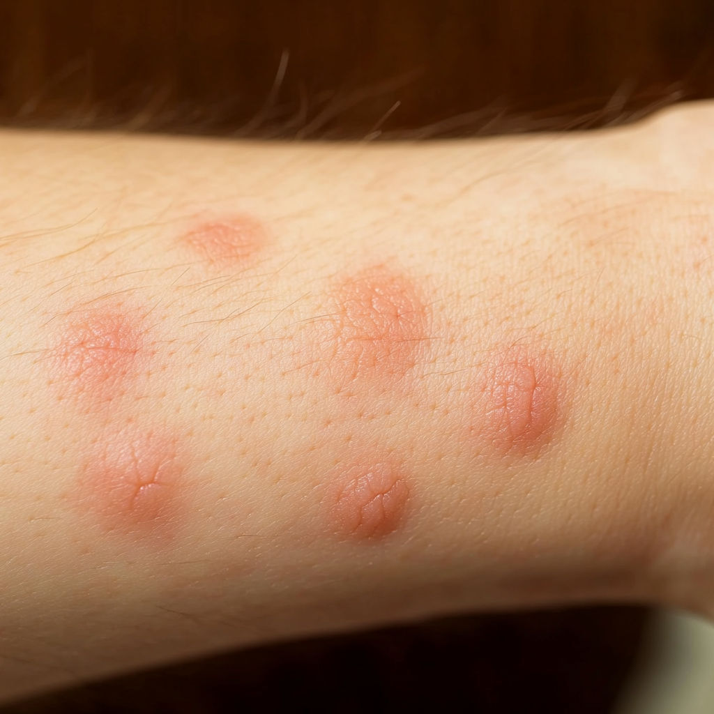 Bed Bug Bite: Bed bugs usually leave a series of bites on exposed skin (arms, neck, face). The bites appear as red, swollen spots with mild itching that can intensify over hours or days.