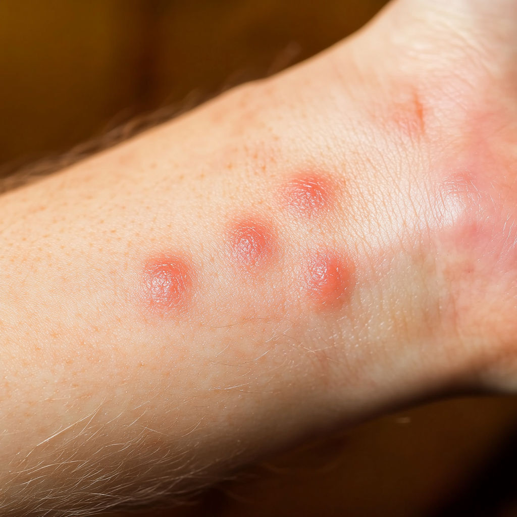 Bed Bug Bite: Bed bugs usually leave a series of bites on exposed skin (arms, neck, face). The bites appear as red, swollen spots with mild itching that can intensify over hours or days.