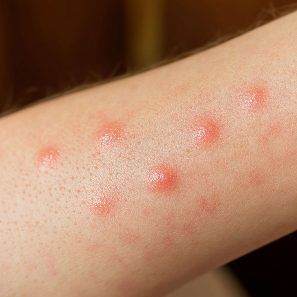 Bed Bug Bite: Bed bugs usually leave a series of bites on exposed skin (arms, neck, face). The bites appear as red, swollen spots with mild itching that can intensify over hours or days.