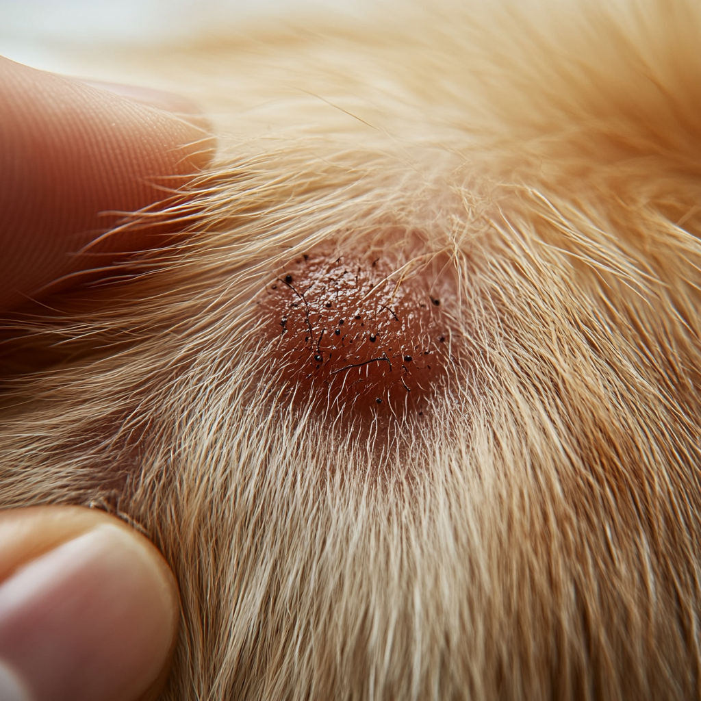 Fleas in fur are small and flat, usually dark brown or black. They are hard to spot as they move quickly and often hide. Flea droppings can be visible as small black dots in the fur. Itching and restlessness are common signs of a flea infestation.