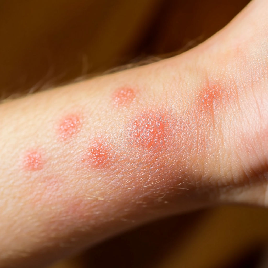 Bed Bug Bite: Bed bugs usually leave a series of bites on exposed skin (arms, neck, face). The bites appear as red, swollen spots with mild itching that can intensify over hours or days.