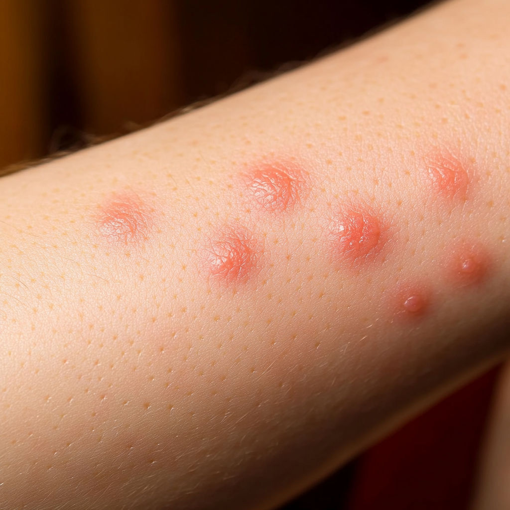 Bed Bug Bite: Bed bugs usually leave a series of bites on exposed skin (arms, neck, face). The bites appear as red, swollen spots with mild itching that can intensify over hours or days.