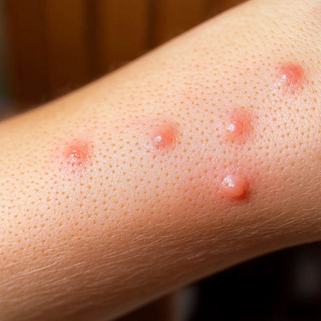 Bed Bug Bite: Bed bugs usually leave a series of bites on exposed skin (arms, neck, face). The bites appear as red, swollen spots with mild itching that can intensify over hours or days.