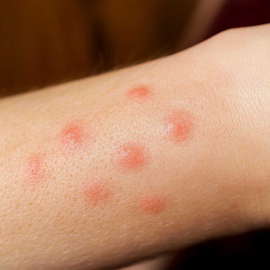 Bed Bug Bite: Bed bugs usually leave a series of bites on exposed skin (arms, neck, face). The bites appear as red, swollen spots with mild itching that can intensify over hours or days.