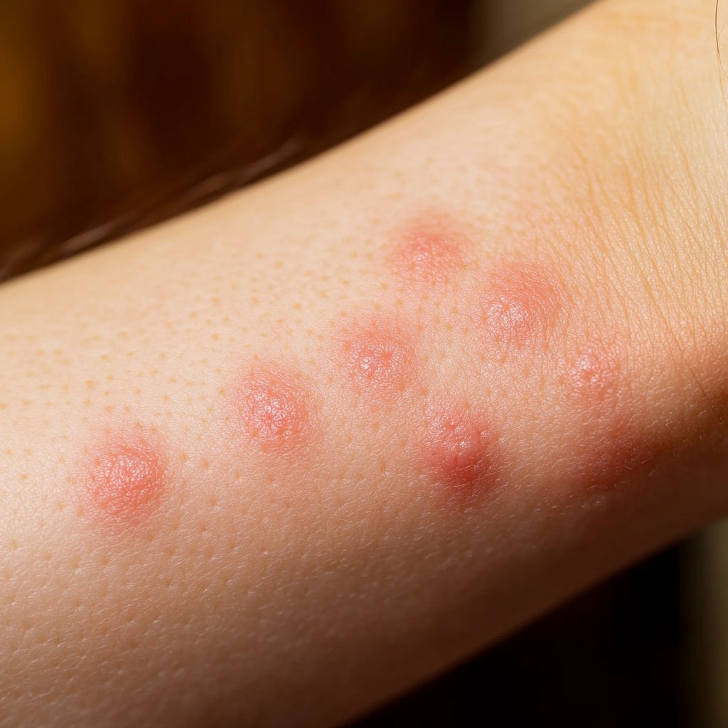 Bed Bug Bite: Bed bugs usually leave a series of bites on exposed skin (arms, neck, face). The bites appear as red, swollen spots with mild itching that can intensify over hours or days.
