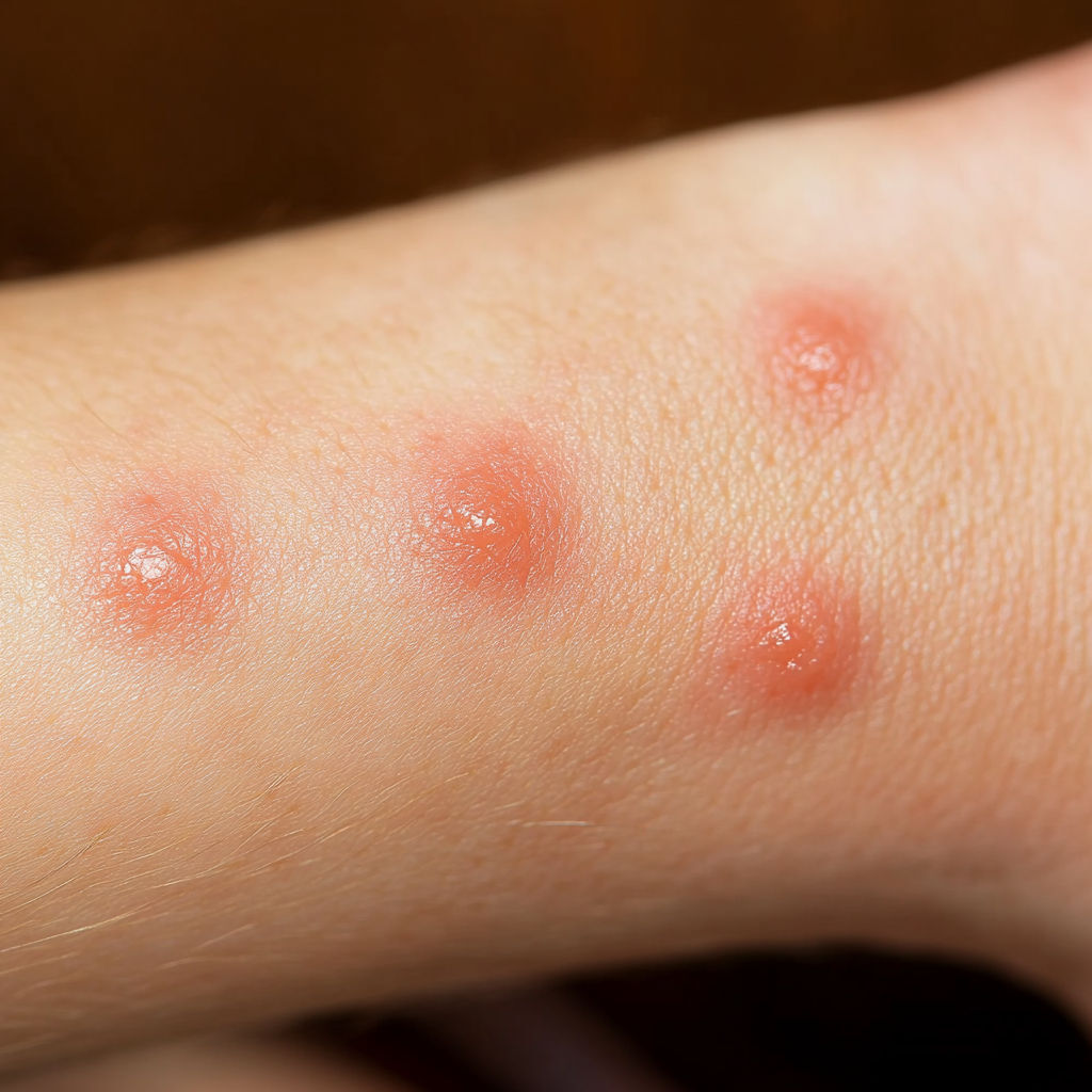 Bed Bug Bite: Bed bugs usually leave a series of bites on exposed skin (arms, neck, face). The bites appear as red, swollen spots with mild itching that can intensify over hours or days.