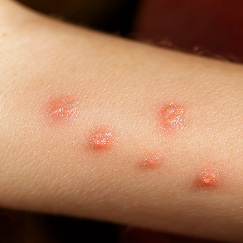 Bed Bug Bite: Bed bugs usually leave a series of bites on exposed skin (arms, neck, face). The bites appear as red, swollen spots with mild itching that can intensify over hours or days.