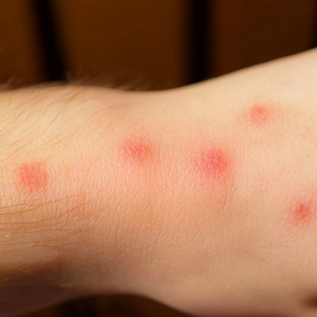 Bed Bug Bite: Bed bugs usually leave a series of bites on exposed skin (arms, neck, face). The bites appear as red, swollen spots with mild itching that can intensify over hours or days.