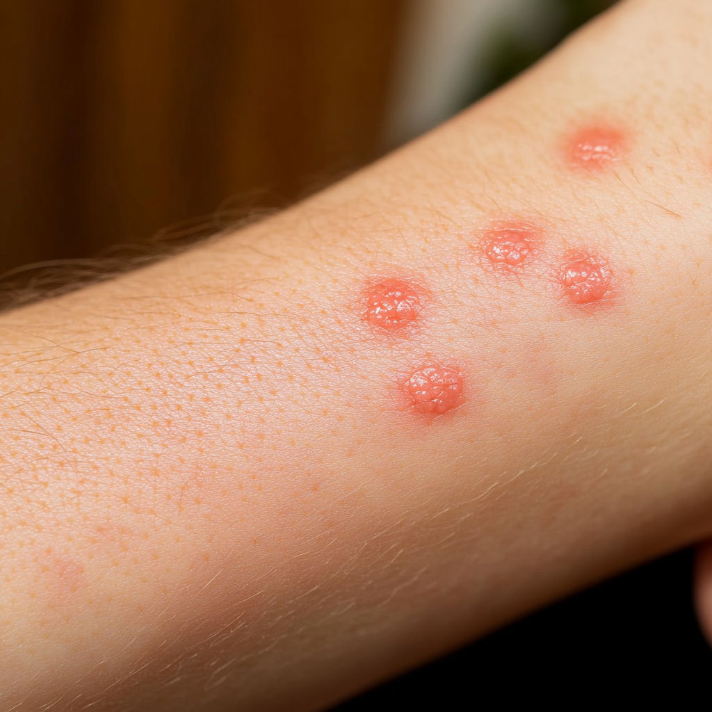Bed Bug Bite: Bed bugs usually leave a series of bites on exposed skin (arms, neck, face). The bites appear as red, swollen spots with mild itching that can intensify over hours or days.