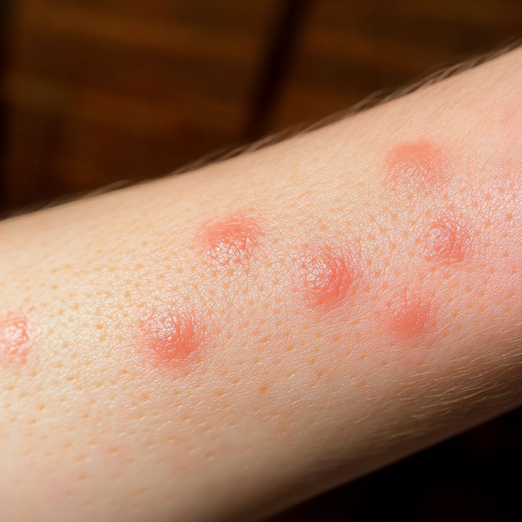 Bed Bug Bite: Bed bugs usually leave a series of bites on exposed skin (arms, neck, face). The bites appear as red, swollen spots with mild itching that can intensify over hours or days.