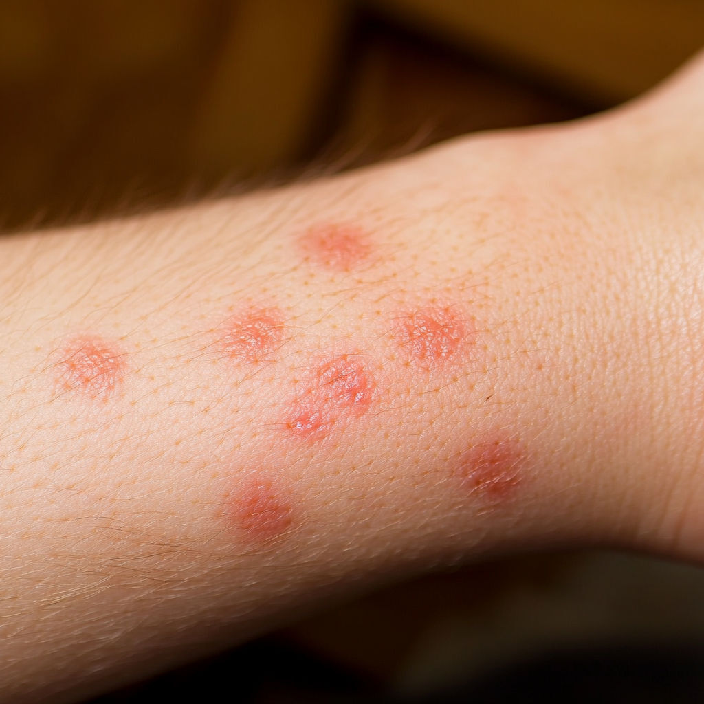 Bed Bug Bite: Bed bugs usually leave a series of bites on exposed skin (arms, neck, face). The bites appear as red, swollen spots with mild itching that can intensify over hours or days.