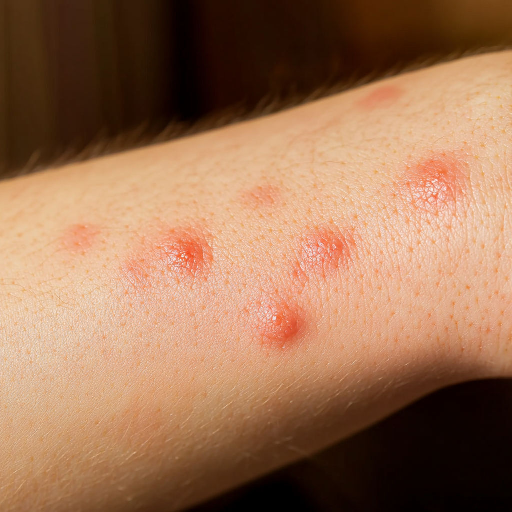 Bed Bug Bite: Bed bugs usually leave a series of bites on exposed skin (arms, neck, face). The bites appear as red, swollen spots with mild itching that can intensify over hours or days.