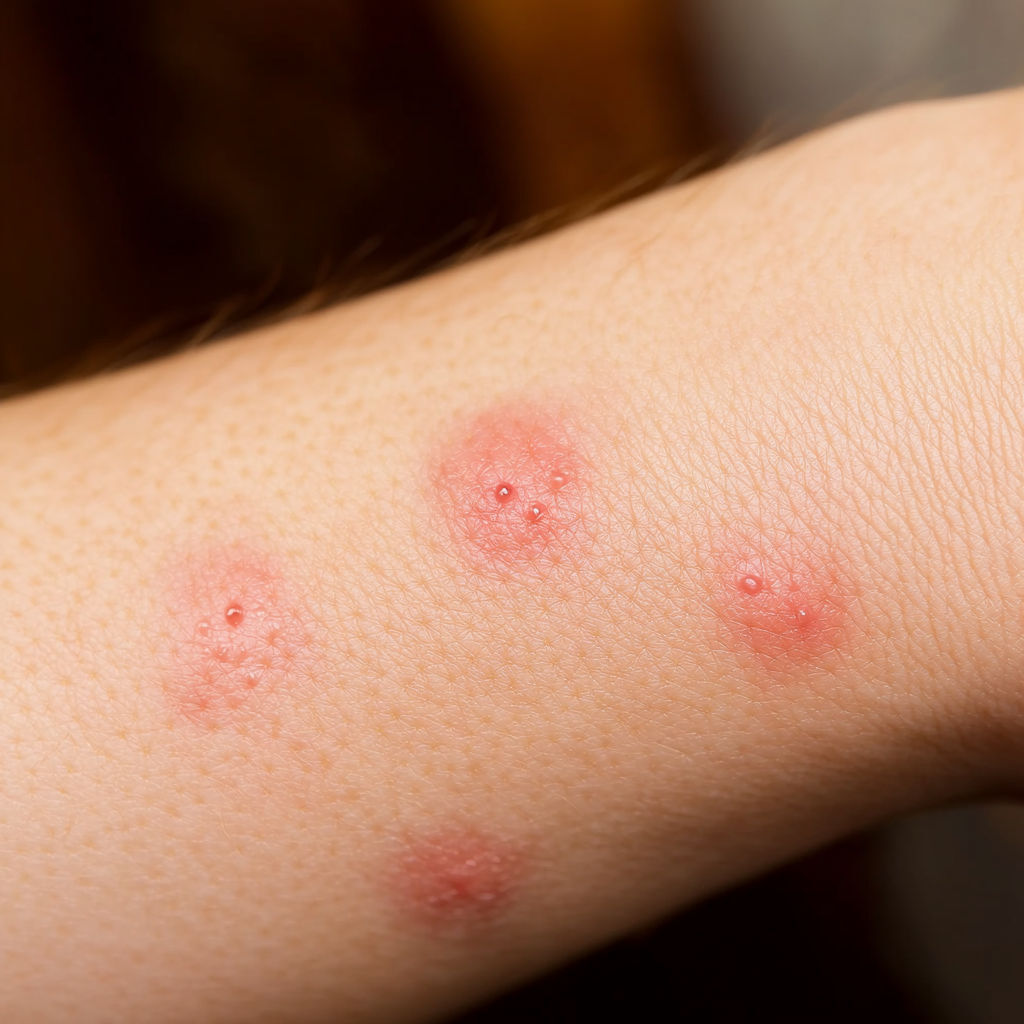 Bed Bug Bite: Bed bugs usually leave a series of bites on exposed skin (arms, neck, face). The bites appear as red, swollen spots with mild itching that can intensify over hours or days.