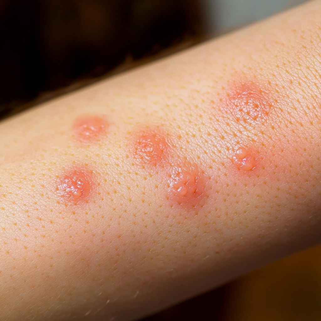 Bed Bug Bite: Bed bugs usually leave a series of bites on exposed skin (arms, neck, face). The bites appear as red, swollen spots with mild itching that can intensify over hours or days.