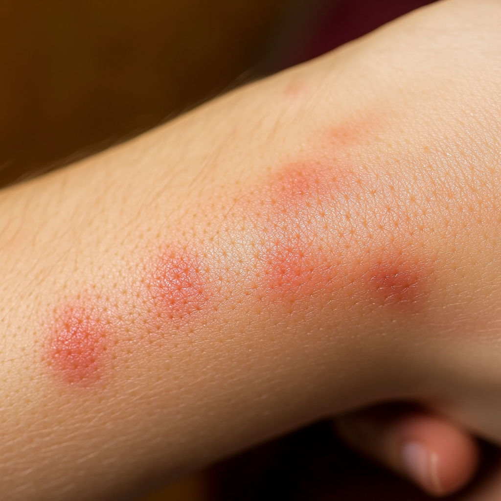 Bed Bug Bite: Bed bugs usually leave a series of bites on exposed skin (arms, neck, face). The bites appear as red, swollen spots with mild itching that can intensify over hours or days.