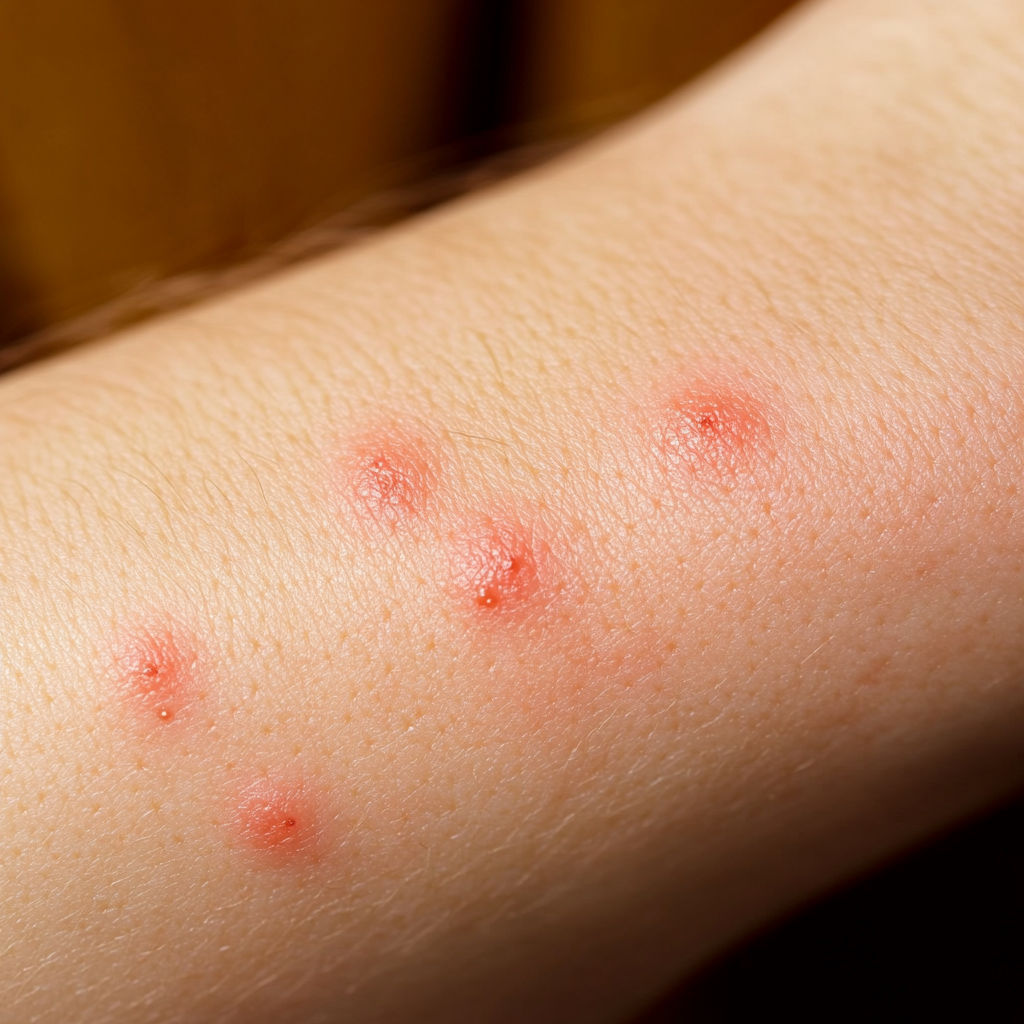 Bed Bug Bite: Bed bugs usually leave a series of bites on exposed skin (arms, neck, face). The bites appear as red, swollen spots with mild itching that can intensify over hours or days.