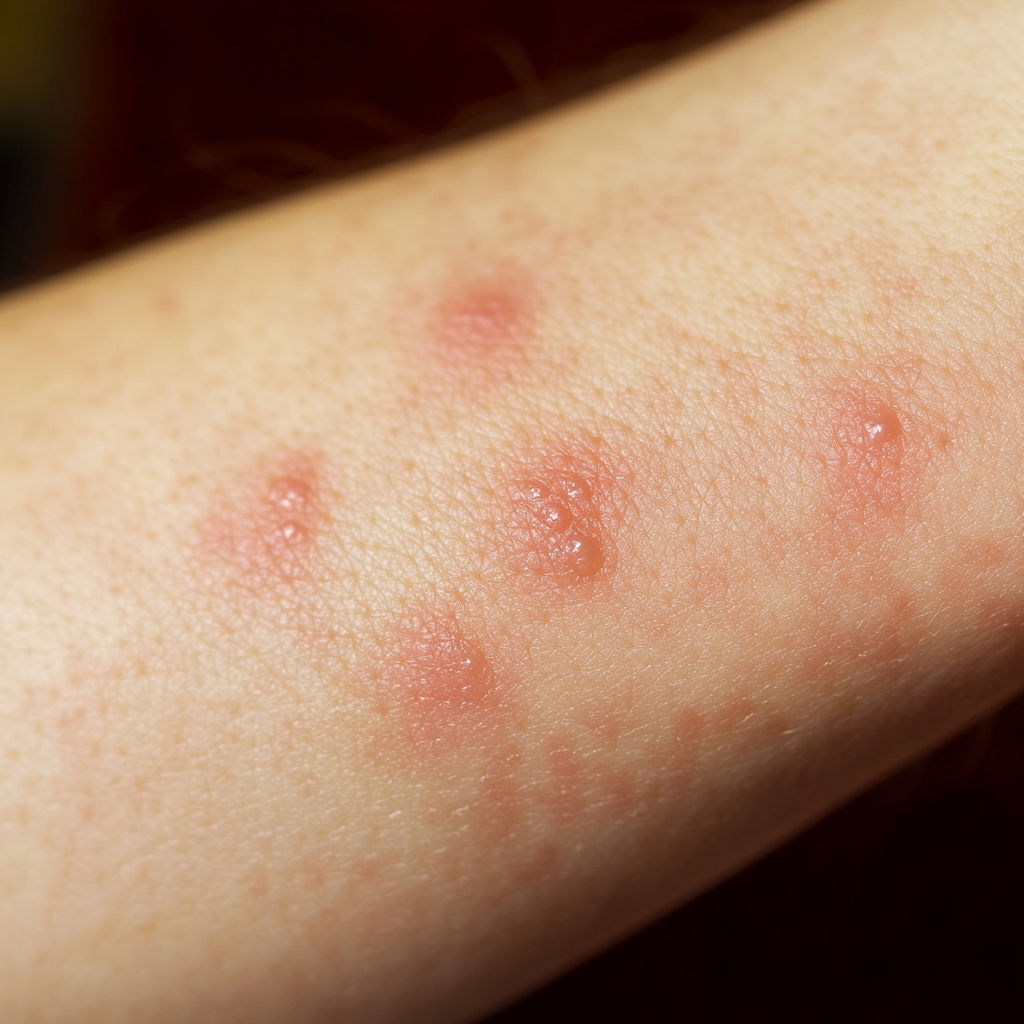 Bed Bug Bite: Bed bugs usually leave a series of bites on exposed skin (arms, neck, face). The bites appear as red, swollen spots with mild itching that can intensify over hours or days.