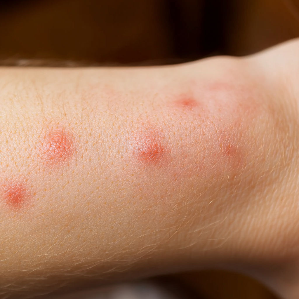 Bed Bug Bite: Bed bugs usually leave a series of bites on exposed skin (arms, neck, face). The bites appear as red, swollen spots with mild itching that can intensify over hours or days.