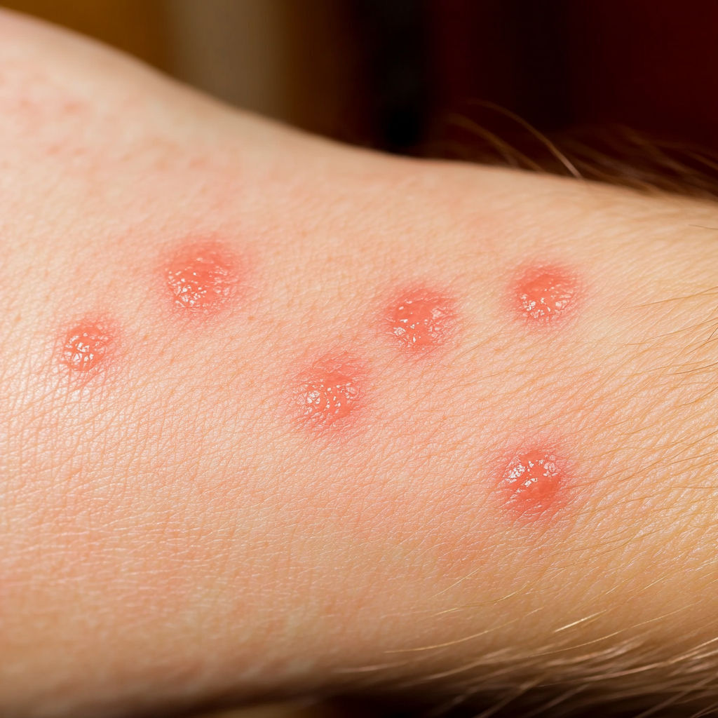 Bed Bug Bite: Bed bugs usually leave a series of bites on exposed skin (arms, neck, face). The bites appear as red, swollen spots with mild itching that can intensify over hours or days.