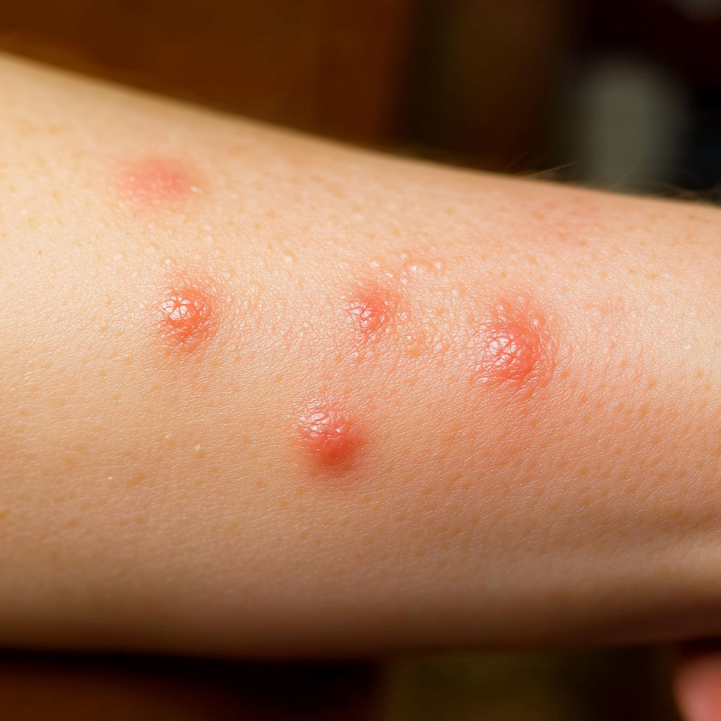 Bed Bug Bite: Bed bugs usually leave a series of bites on exposed skin (arms, neck, face). The bites appear as red, swollen spots with mild itching that can intensify over hours or days.