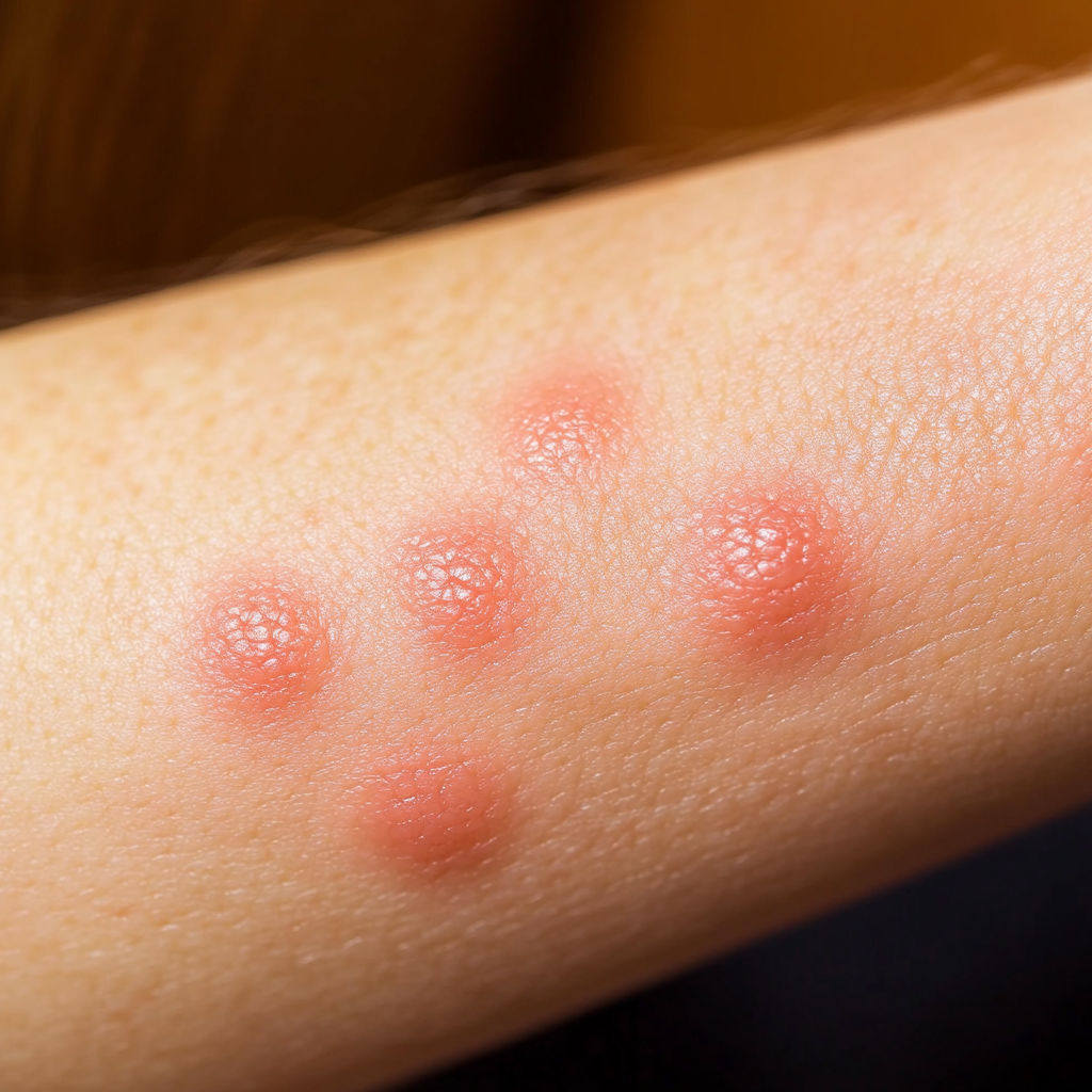 Bed Bug Bite: Bed bugs usually leave a series of bites on exposed skin (arms, neck, face). The bites appear as red, swollen spots with mild itching that can intensify over hours or days.