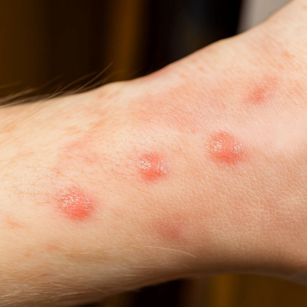 Bed Bug Bite: Bed bugs usually leave a series of bites on exposed skin (arms, neck, face). The bites appear as red, swollen spots with mild itching that can intensify over hours or days.