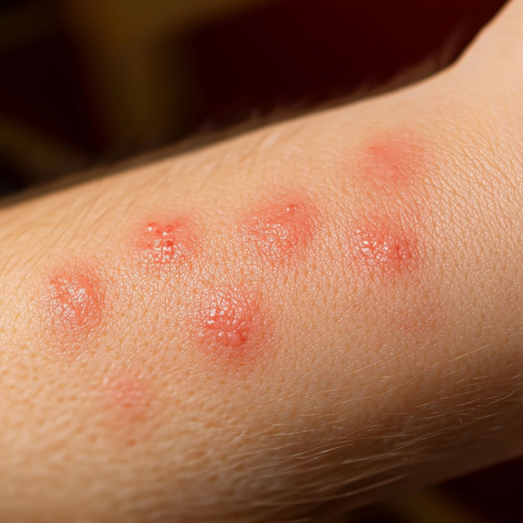 Bed Bug Bite: Bed bugs usually leave a series of bites on exposed skin (arms, neck, face). The bites appear as red, swollen spots with mild itching that can intensify over hours or days.