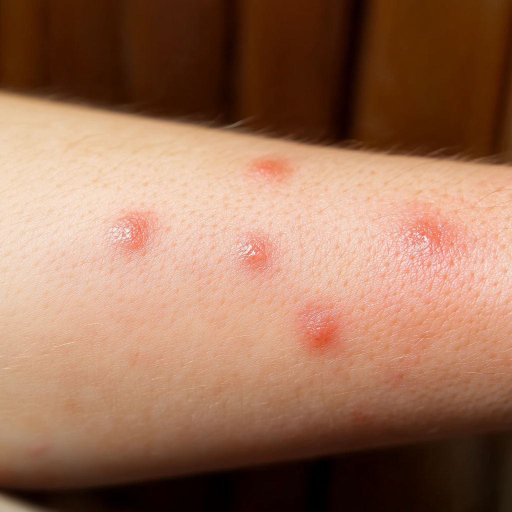 Bed Bug Bite: Bed bugs usually leave a series of bites on exposed skin (arms, neck, face). The bites appear as red, swollen spots with mild itching that can intensify over hours or days.
