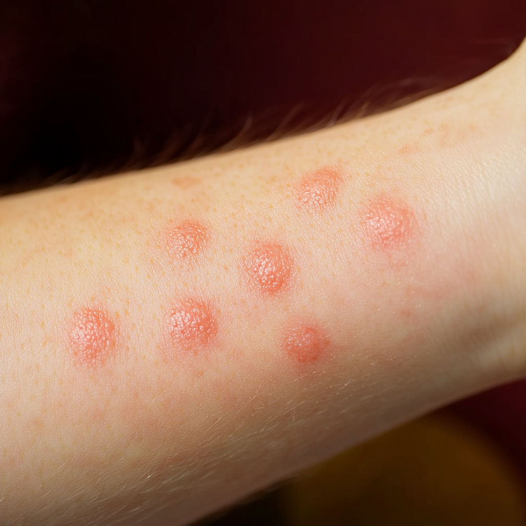 Bed Bug Bite: Bed bugs usually leave a series of bites on exposed skin (arms, neck, face). The bites appear as red, swollen spots with mild itching that can intensify over hours or days.