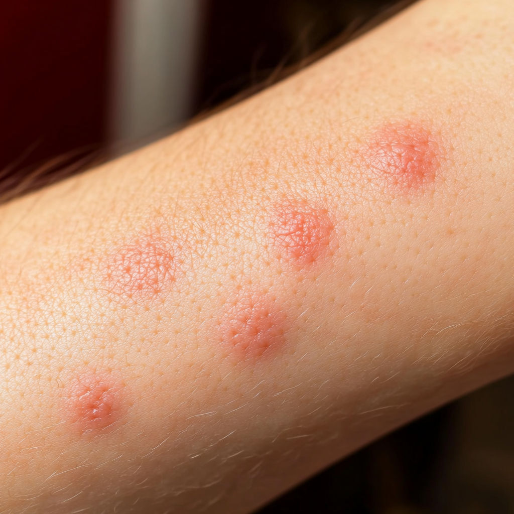 Bed Bug Bite: Bed bugs usually leave a series of bites on exposed skin (arms, neck, face). The bites appear as red, swollen spots with mild itching that can intensify over hours or days.