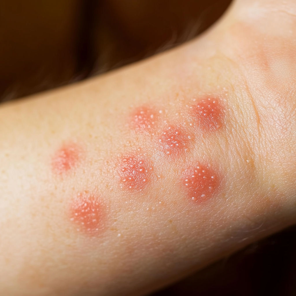 Bed Bug Bite: Bed bugs usually leave a series of bites on exposed skin (arms, neck, face). The bites appear as red, swollen spots with mild itching that can intensify over hours or days.