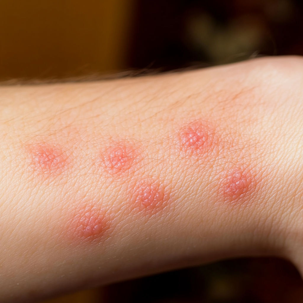 Bed Bug Bite: Bed bugs usually leave a series of bites on exposed skin (arms, neck, face). The bites appear as red, swollen spots with mild itching that can intensify over hours or days.