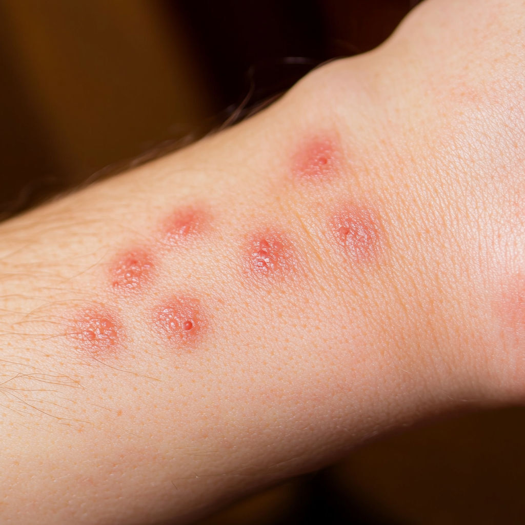 Bed Bug Bite: Bed bugs usually leave a series of bites on exposed skin (arms, neck, face). The bites appear as red, swollen spots with mild itching that can intensify over hours or days.