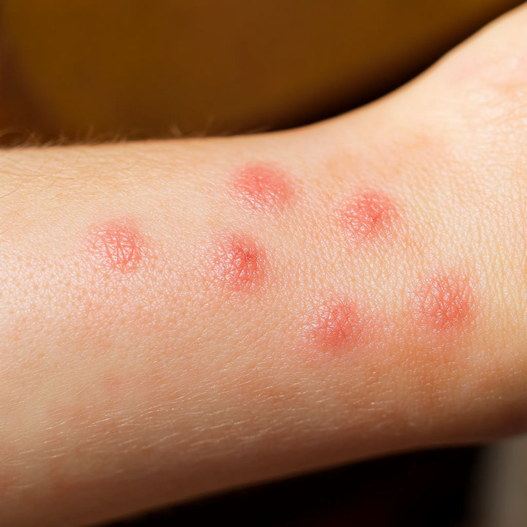 Bed Bug Bite: Bed bugs usually leave a series of bites on exposed skin (arms, neck, face). The bites appear as red, swollen spots with mild itching that can intensify over hours or days.