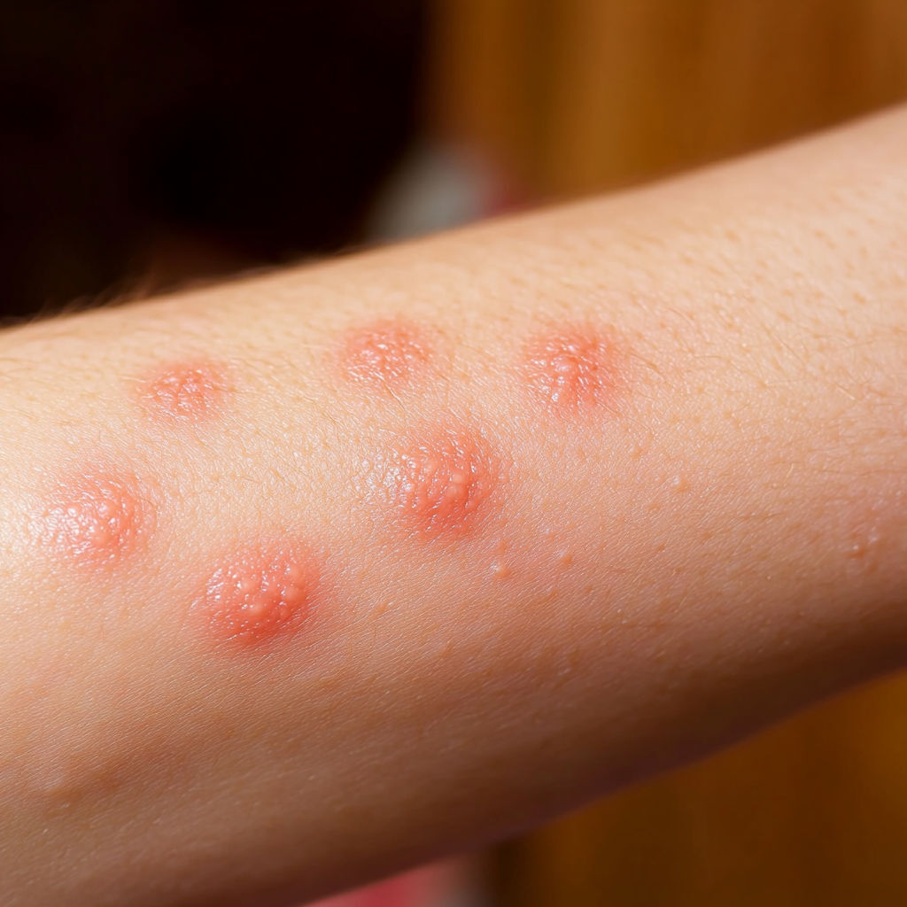 Bed Bug Bite: Bed bugs usually leave a series of bites on exposed skin (arms, neck, face). The bites appear as red, swollen spots with mild itching that can intensify over hours or days.