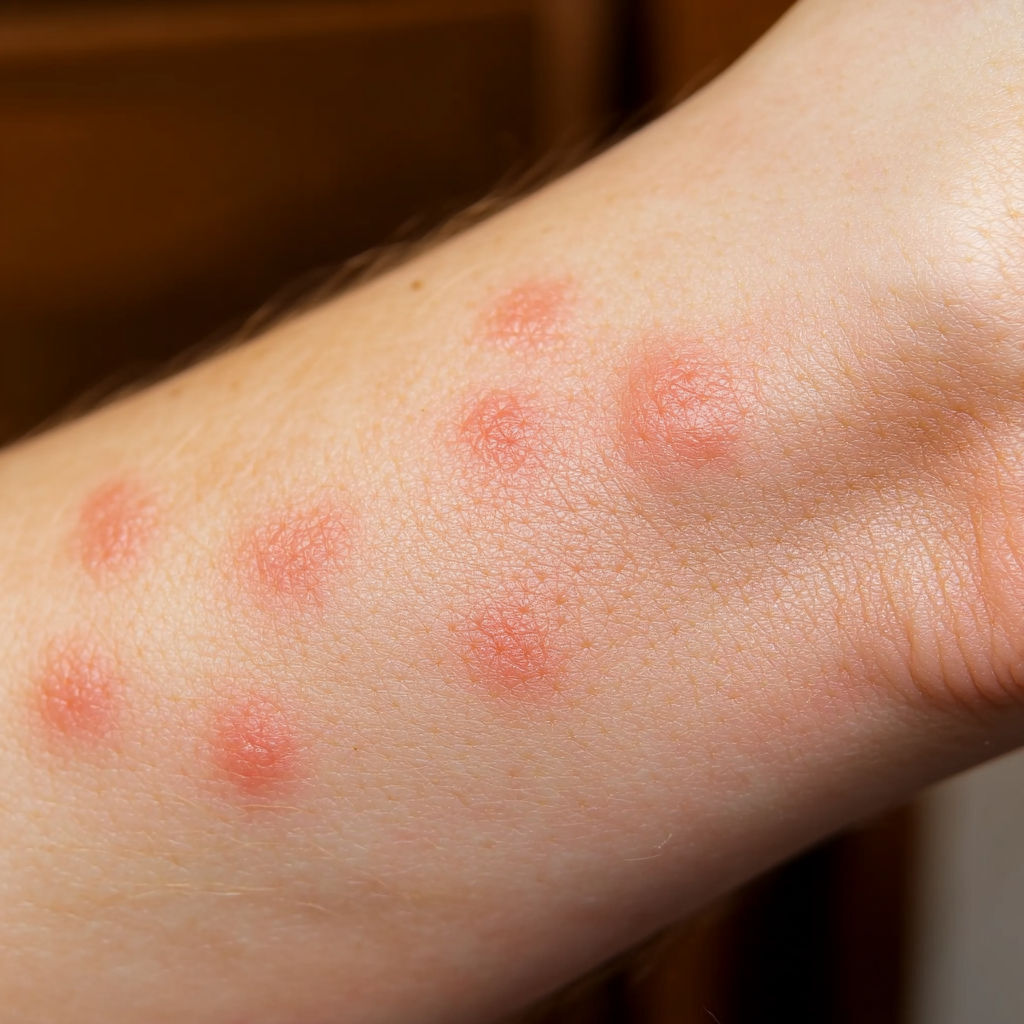 Bed Bug Bite: Bed bugs usually leave a series of bites on exposed skin (arms, neck, face). The bites appear as red, swollen spots with mild itching that can intensify over hours or days.