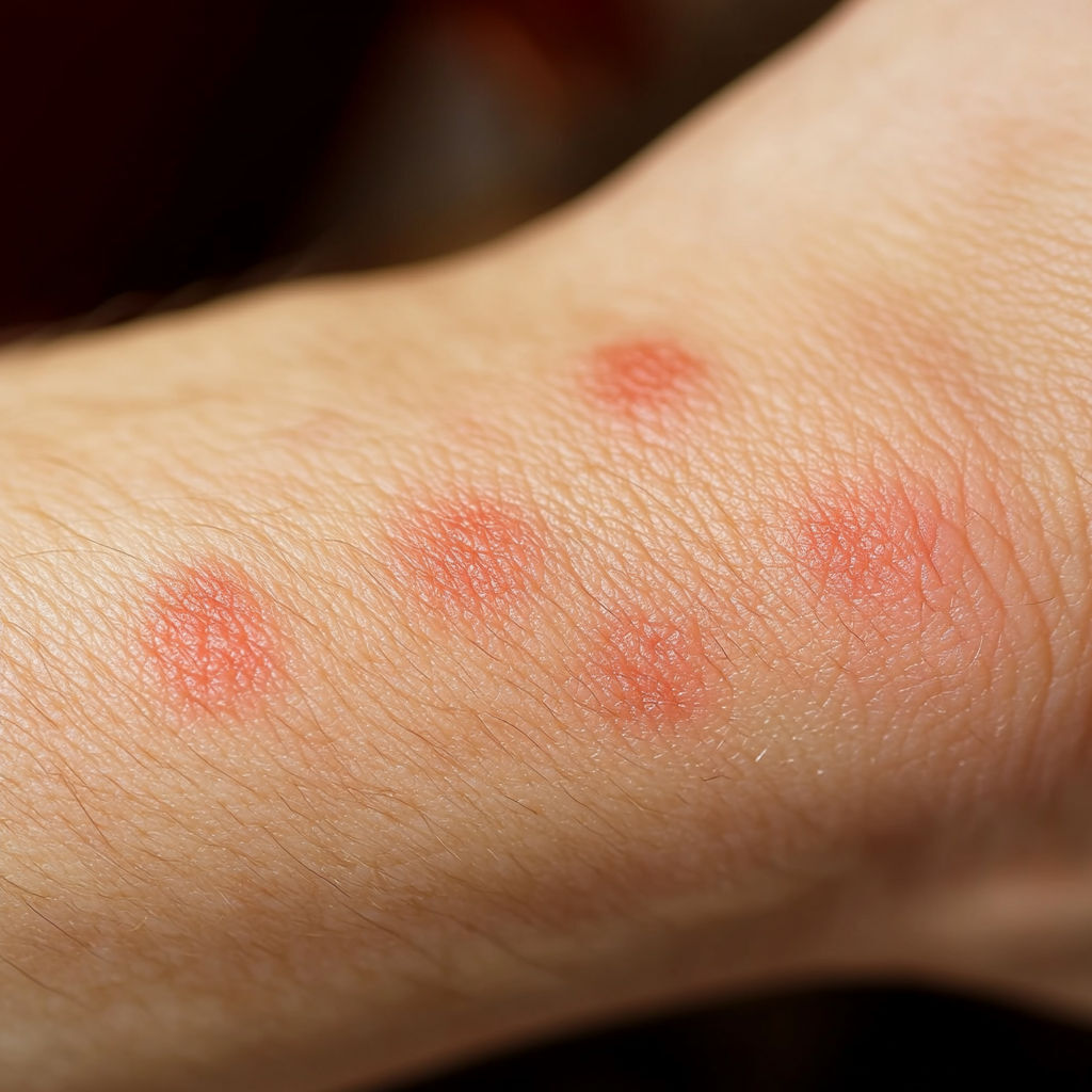 Bed Bug Bite: Bed bugs usually leave a series of bites on exposed skin (arms, neck, face). The bites appear as red, swollen spots with mild itching that can intensify over hours or days.