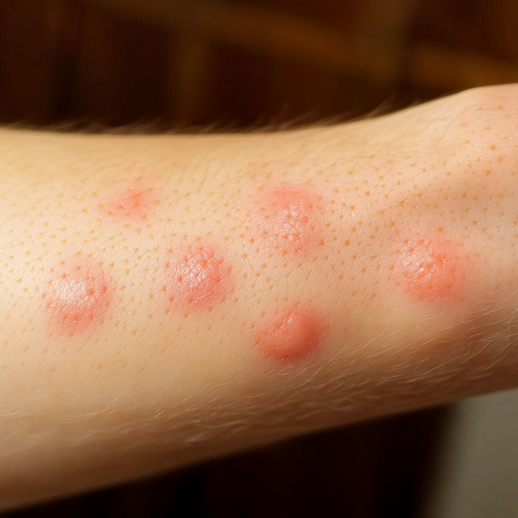 Bed Bug Bite: Bed bugs usually leave a series of bites on exposed skin (arms, neck, face). The bites appear as red, swollen spots with mild itching that can intensify over hours or days.