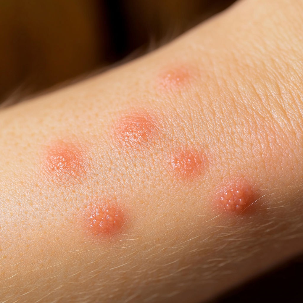 Bed Bug Bite: Bed bugs usually leave a series of bites on exposed skin (arms, neck, face). The bites appear as red, swollen spots with mild itching that can intensify over hours or days.