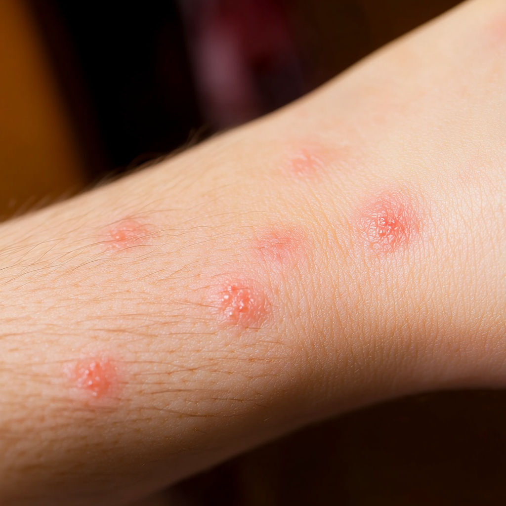Bed Bug Bite: Bed bugs usually leave a series of bites on exposed skin (arms, neck, face). The bites appear as red, swollen spots with mild itching that can intensify over hours or days.