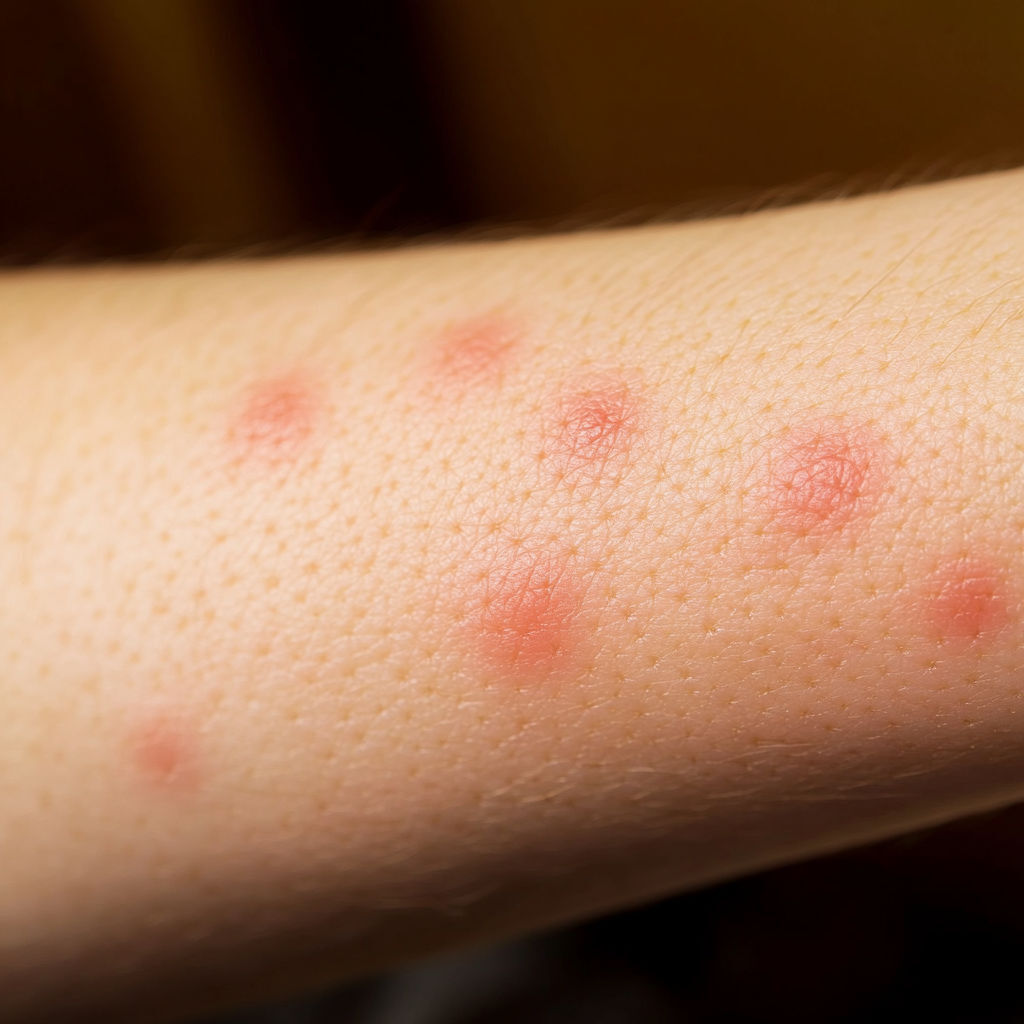 Bed Bug Bite: Bed bugs usually leave a series of bites on exposed skin (arms, neck, face). The bites appear as red, swollen spots with mild itching that can intensify over hours or days.