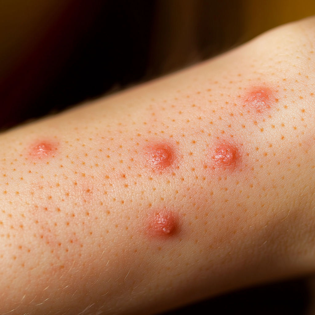 Bed Bug Bite: Bed bugs usually leave a series of bites on exposed skin (arms, neck, face). The bites appear as red, swollen spots with mild itching that can intensify over hours or days.