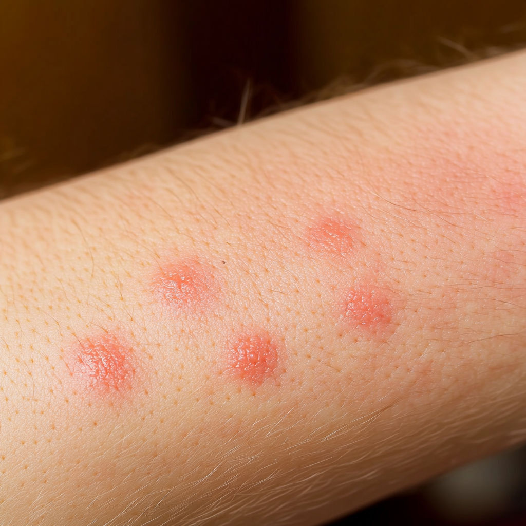 Bed Bug Bite: Bed bugs usually leave a series of bites on exposed skin (arms, neck, face). The bites appear as red, swollen spots with mild itching that can intensify over hours or days.