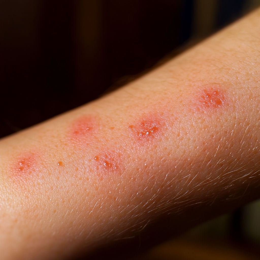 Bed Bug Bite: Bed bugs usually leave a series of bites on exposed skin (arms, neck, face). The bites appear as red, swollen spots with mild itching that can intensify over hours or days.