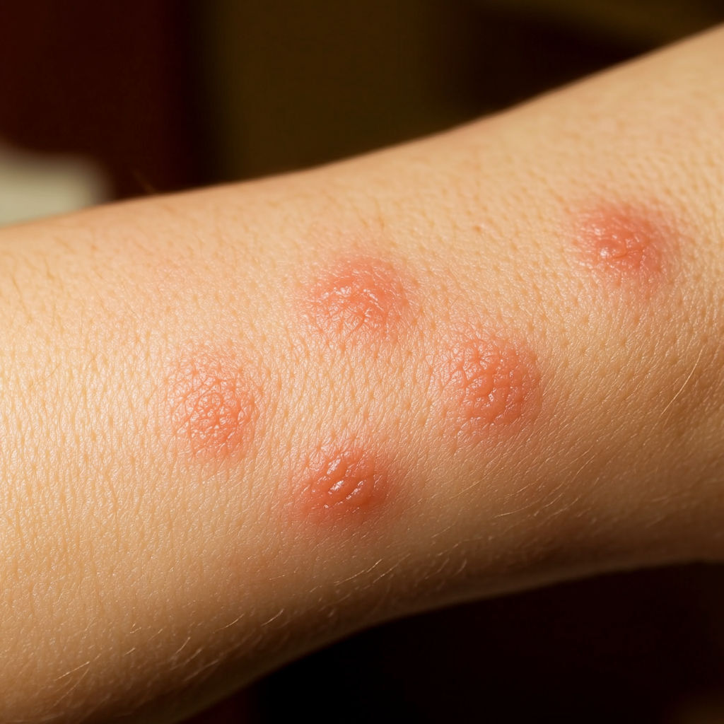 Bed Bug Bite: Bed bugs usually leave a series of bites on exposed skin (arms, neck, face). The bites appear as red, swollen spots with mild itching that can intensify over hours or days.