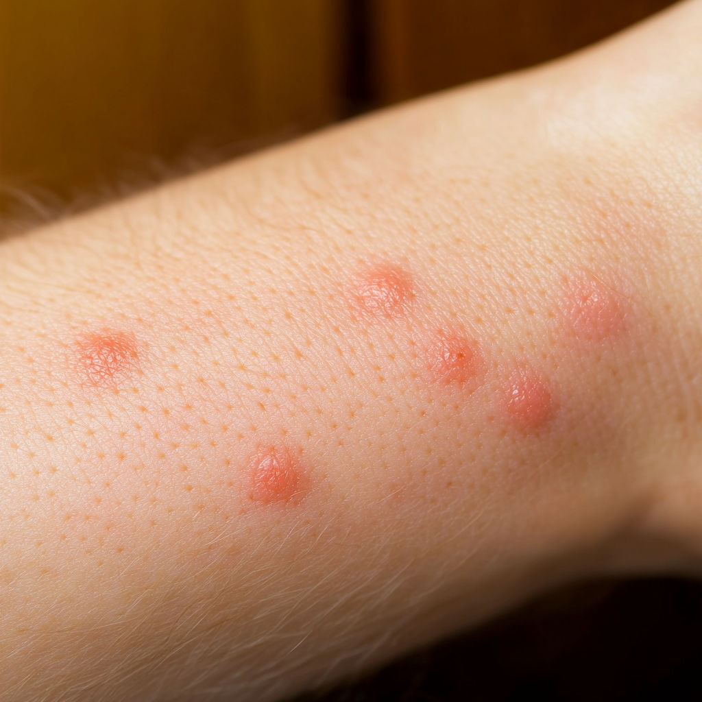 Bed Bug Bite: Bed bugs usually leave a series of bites on exposed skin (arms, neck, face). The bites appear as red, swollen spots with mild itching that can intensify over hours or days.