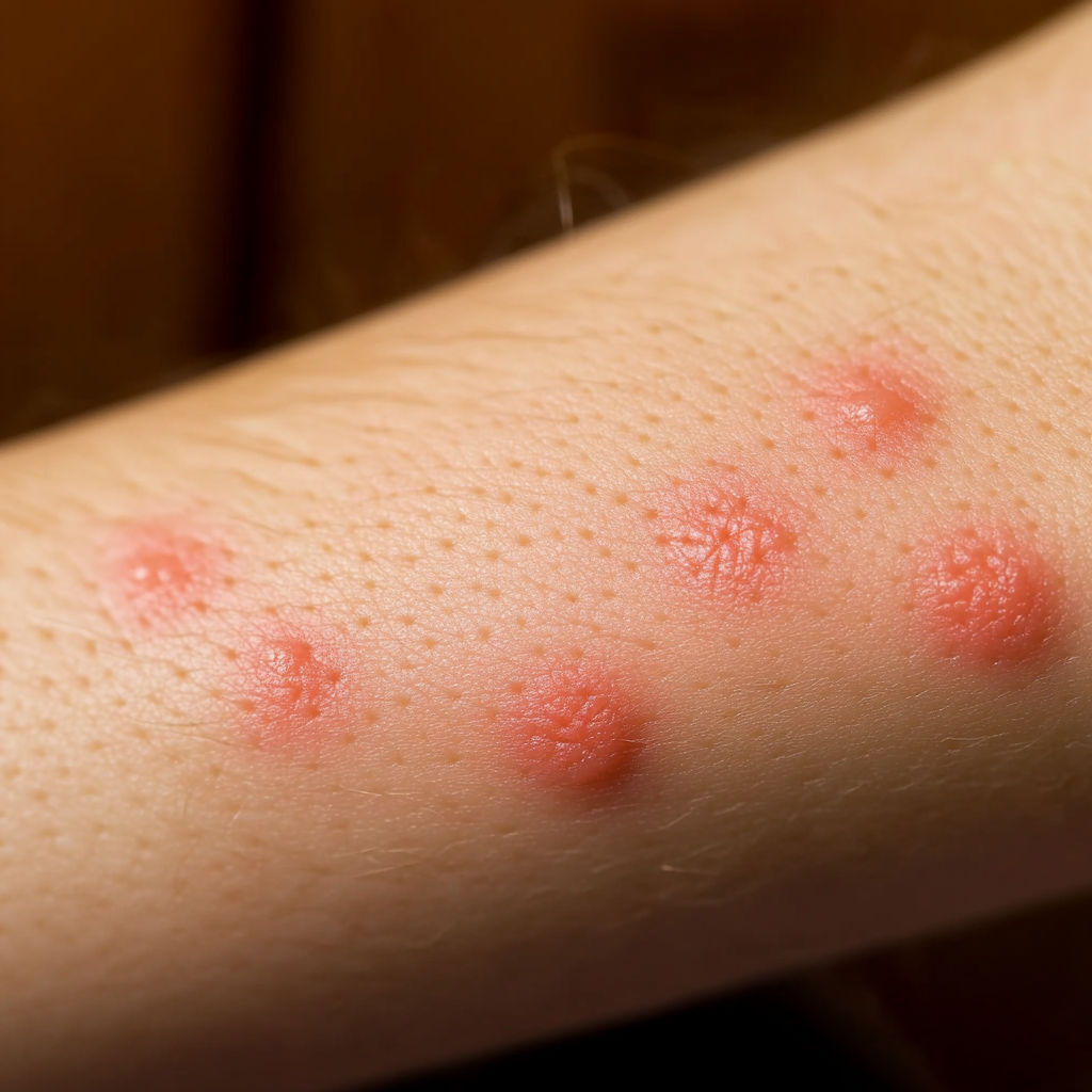 Bed Bug Bite: Bed bugs usually leave a series of bites on exposed skin (arms, neck, face). The bites appear as red, swollen spots with mild itching that can intensify over hours or days.